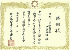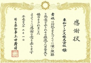 2月1日に開催された「防犯のまちづくりに関する協定締結事業者連絡会議」において、東和アークス(株)の日ごろの防犯活動に対し、埼玉県から感謝状をいただきました。