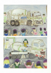 児童達は2班に分かれ、工場にあるプラント、ミキサー車、ショベルローダー等を鉛筆で下書きし、クレヨンで清書をしていました。
