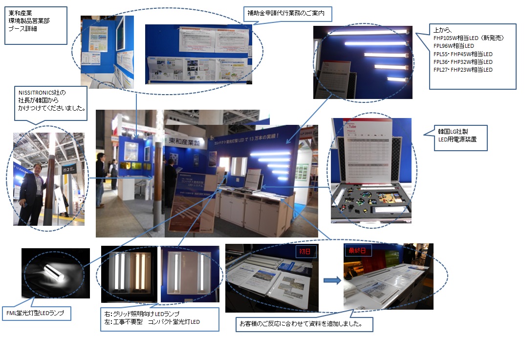 出展製品:グリッド照明向けLED、工事不要型コンパクト蛍光灯型LED、 FML蛍光型LED、LG社製 LED用電源装置、韓国製 木製街路灯ポール、経済産業省「地域工場・中小企業等の省エネルギー設備導入補助金/最新モデル省エネルギー機器等導入支援事業(A類型)」補助金申請代行業務開始のご案内