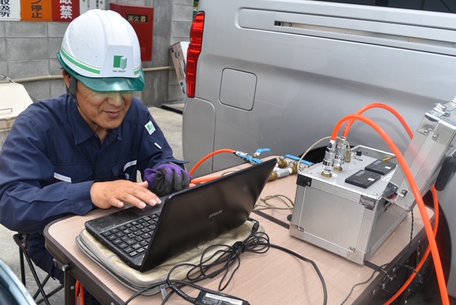 検査時間はタンクの容量によって異なりますが、10klタンクで1時間20分程度になります。(計測時間30分+加圧時間20分+設置時間30分)